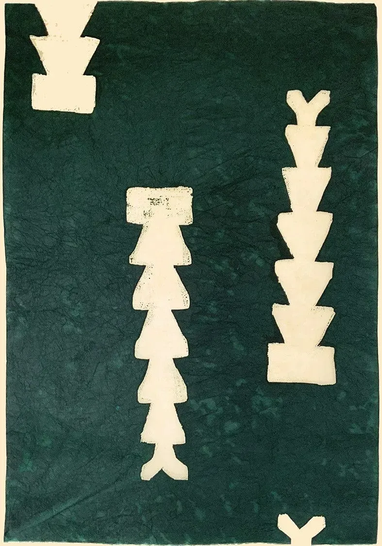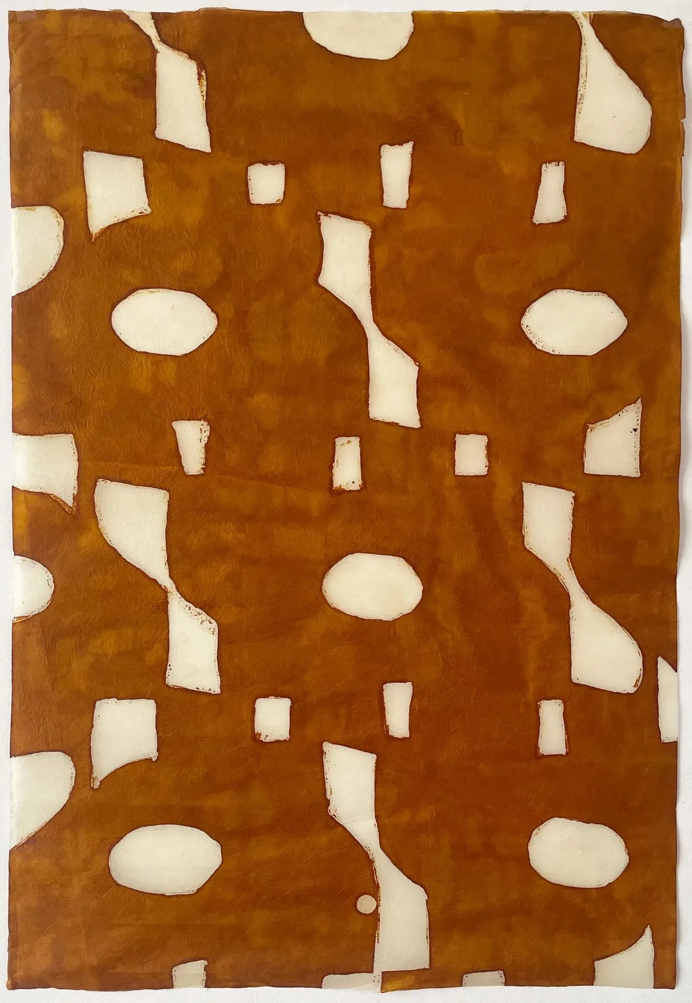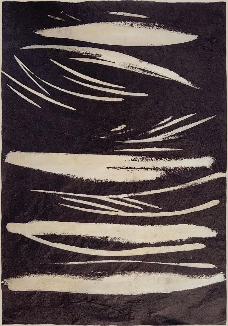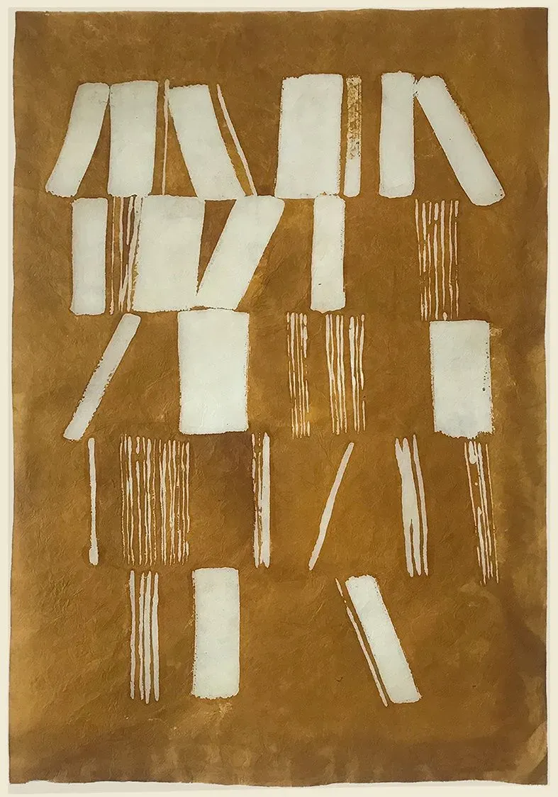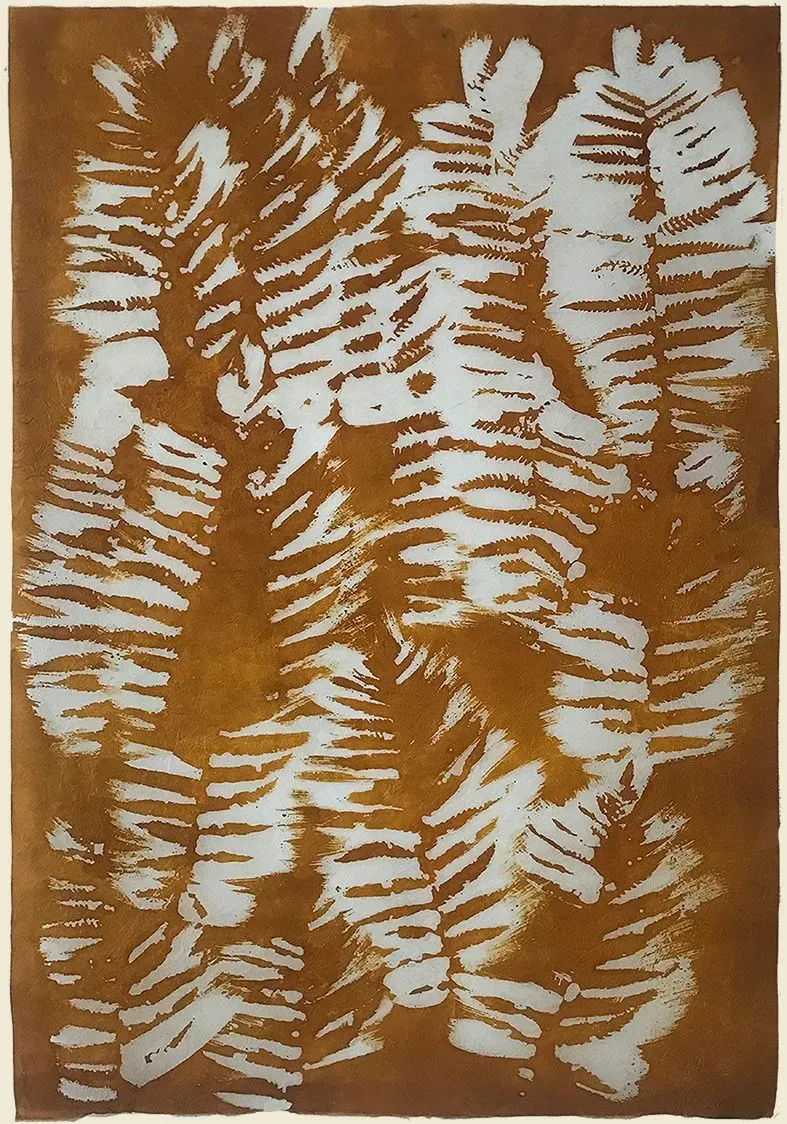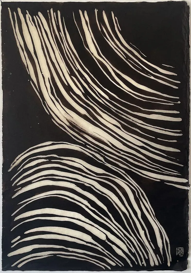 La cire fond dans la casserole, nous y plongeons nos pinceaux pour peindre en réserve des tracés bruts et des aplats que l’encre évite.