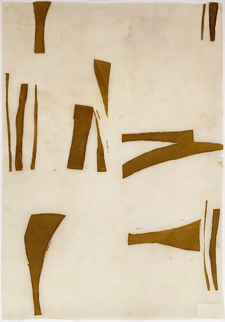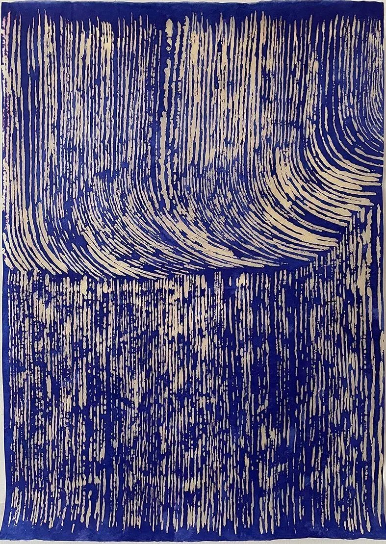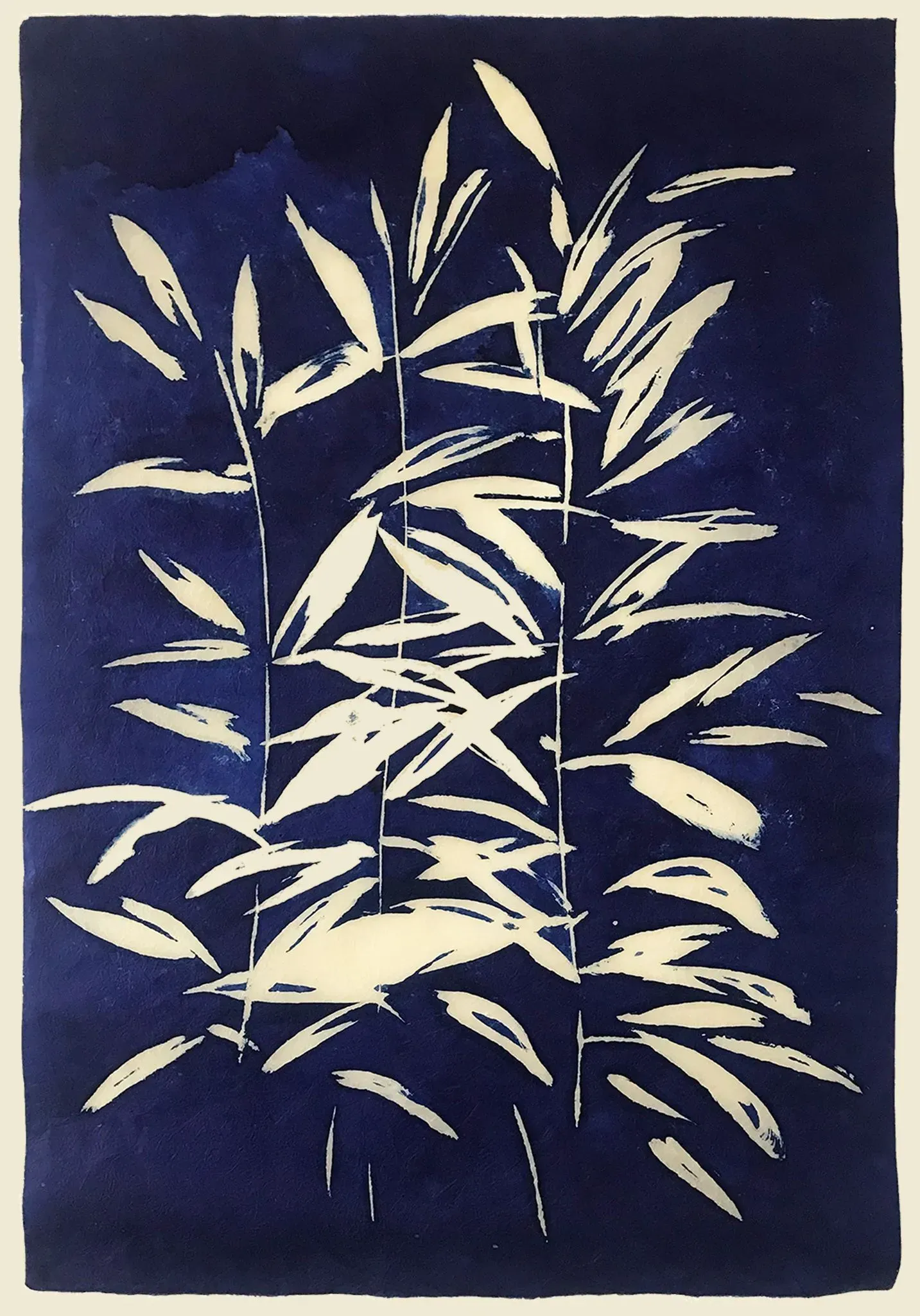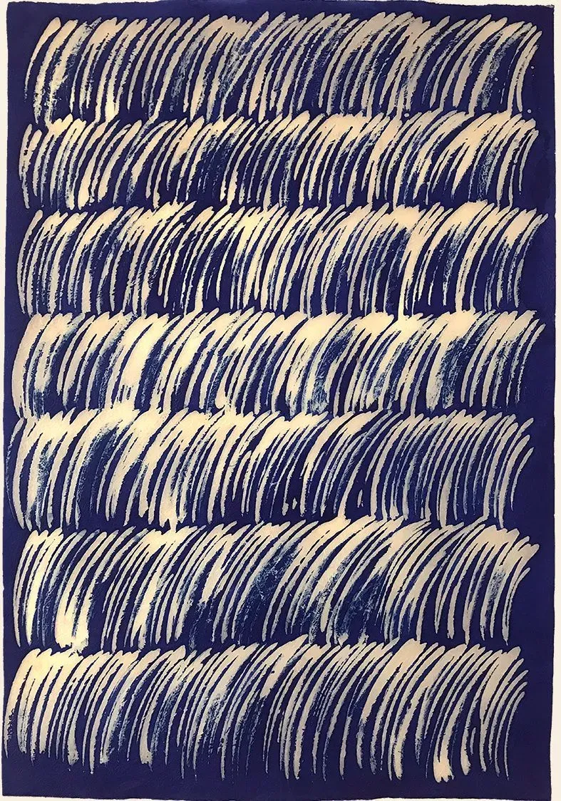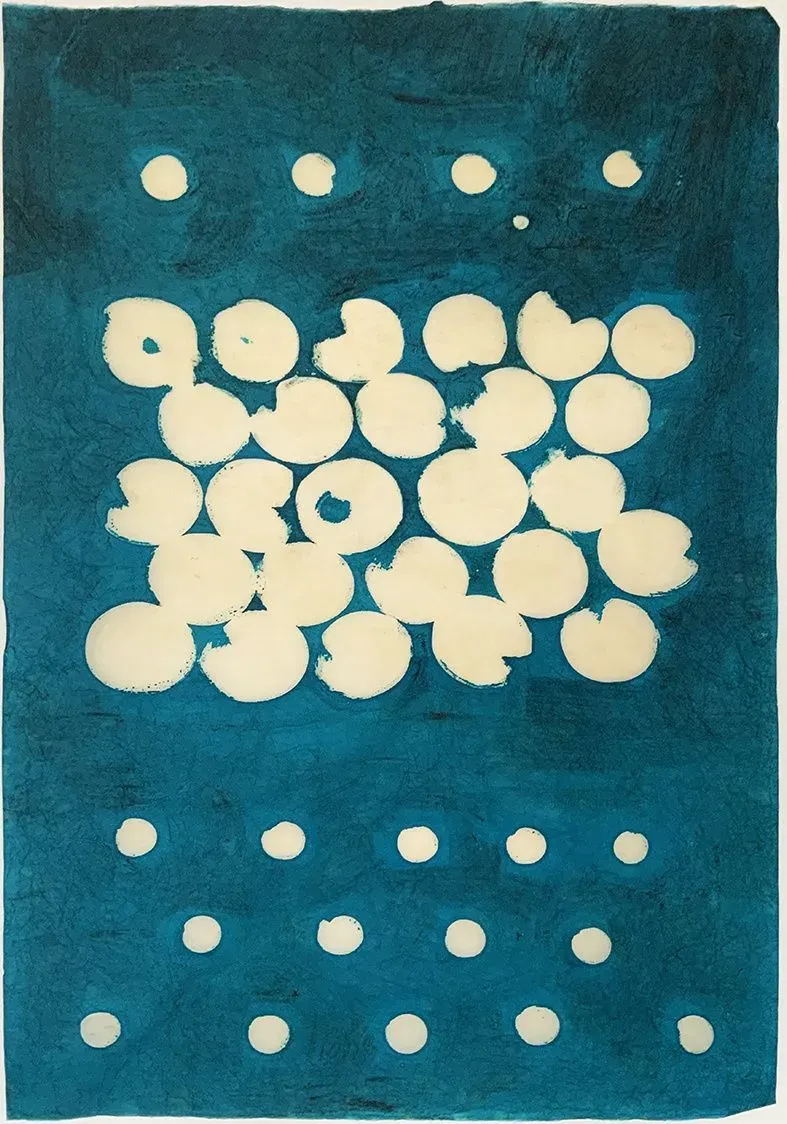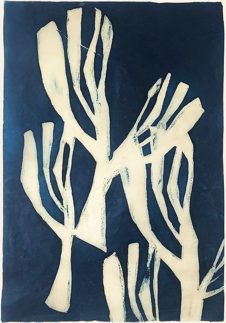 La cire fond dans la casserole, nous y plongeons nos pinceaux pour peindre en réserve des tracés bruts et des aplats que l’encre évite.