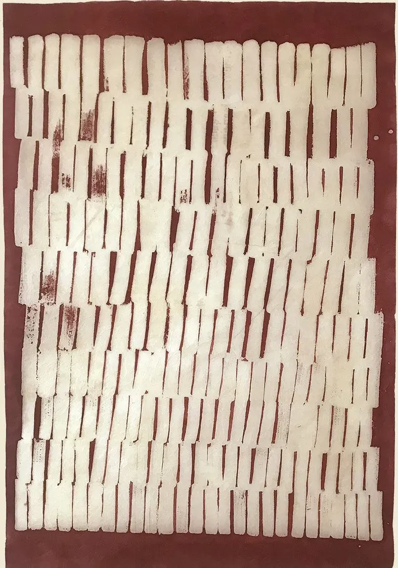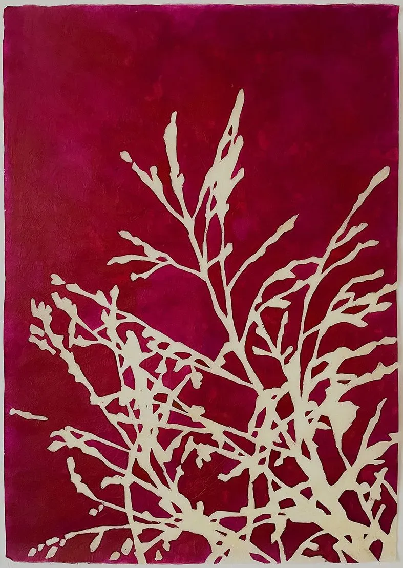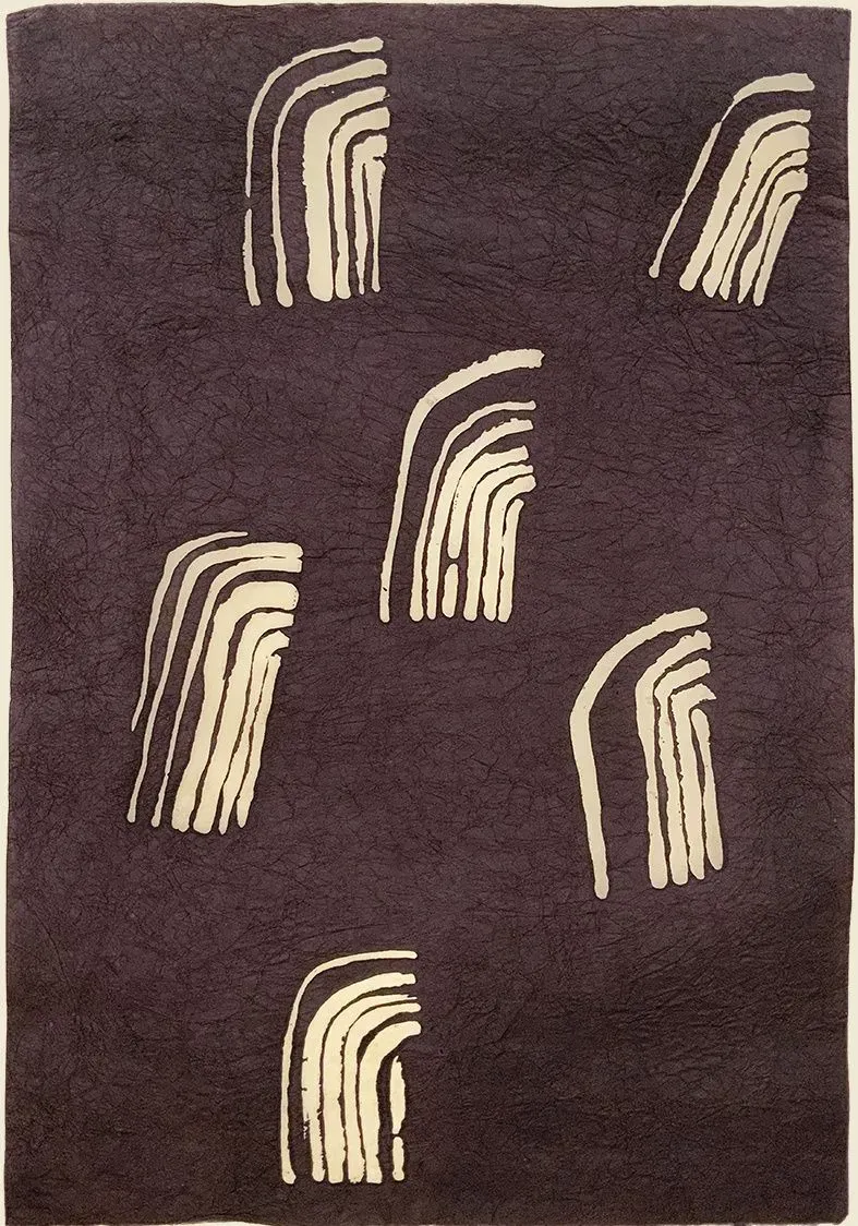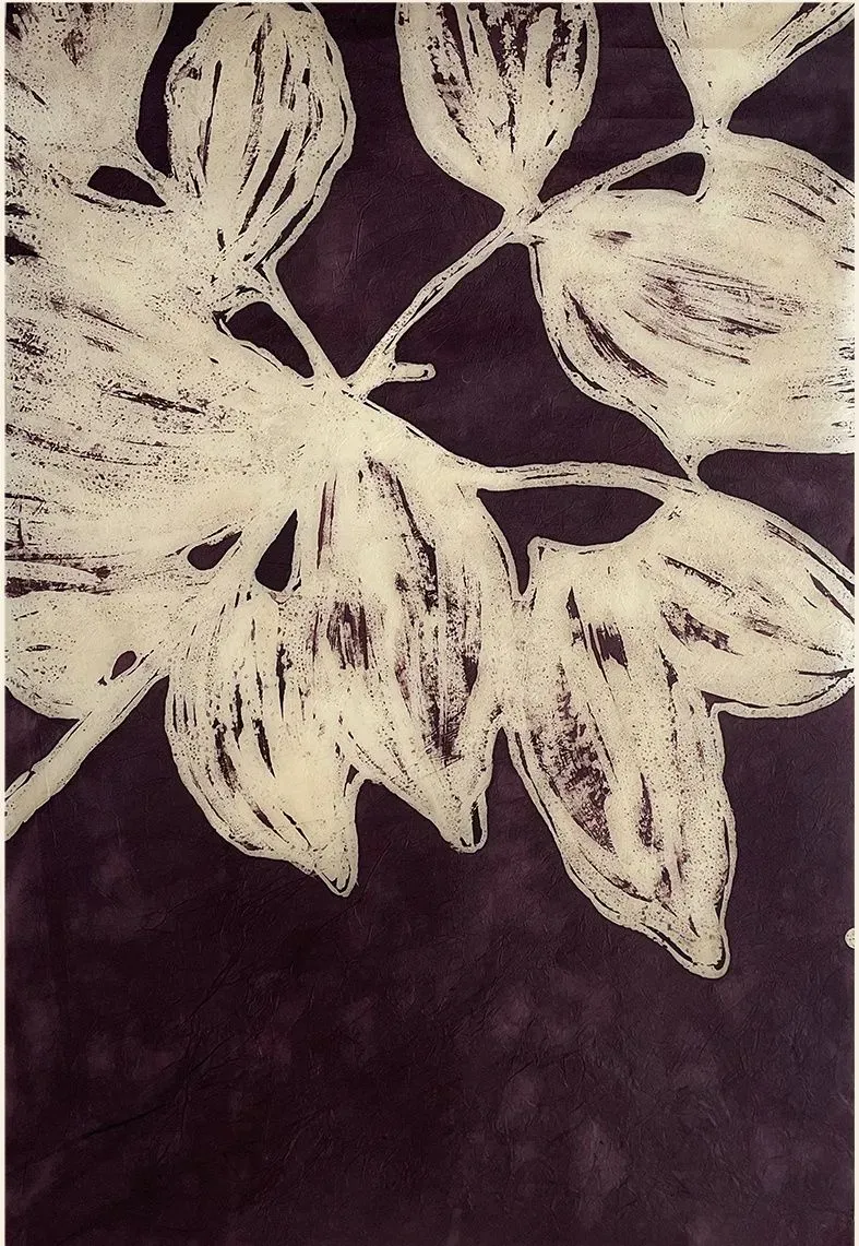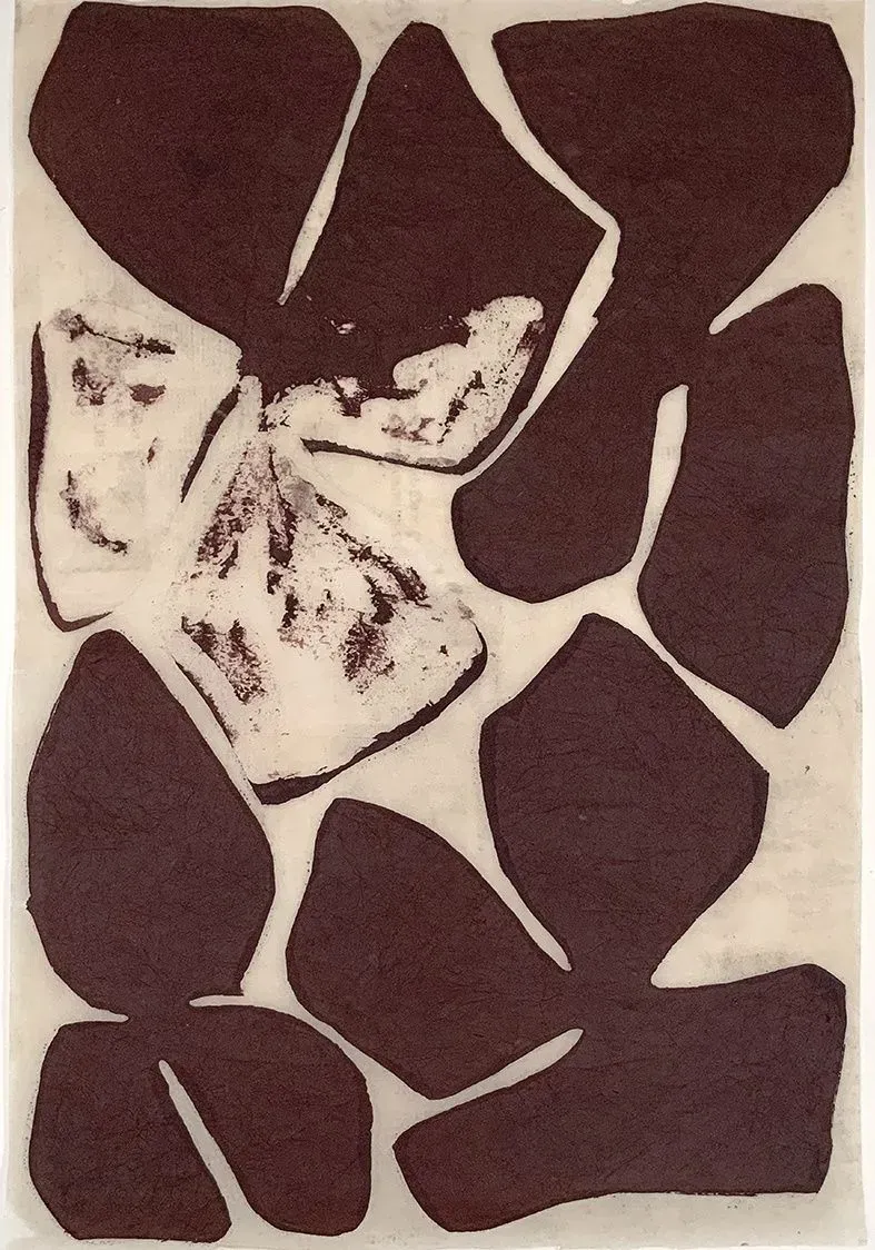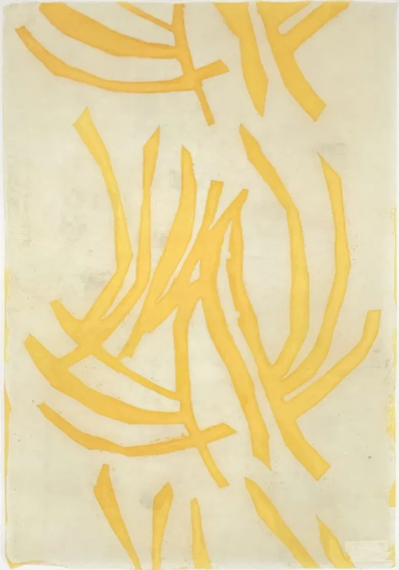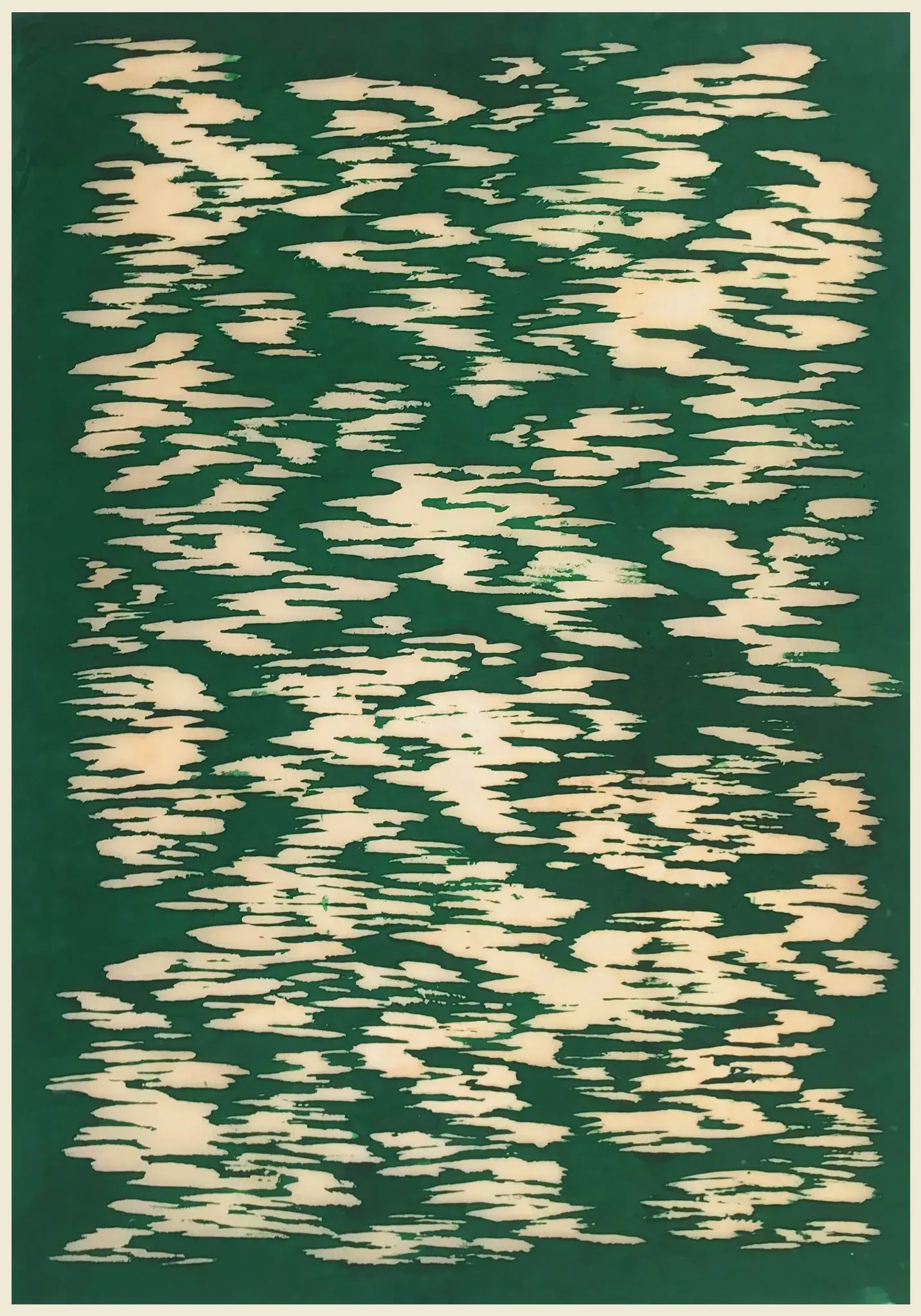 La cire fond dans la casserole, nous y plongeons nos pinceaux pour peindre en réserve des tracés bruts et des aplats que l’encre évite.