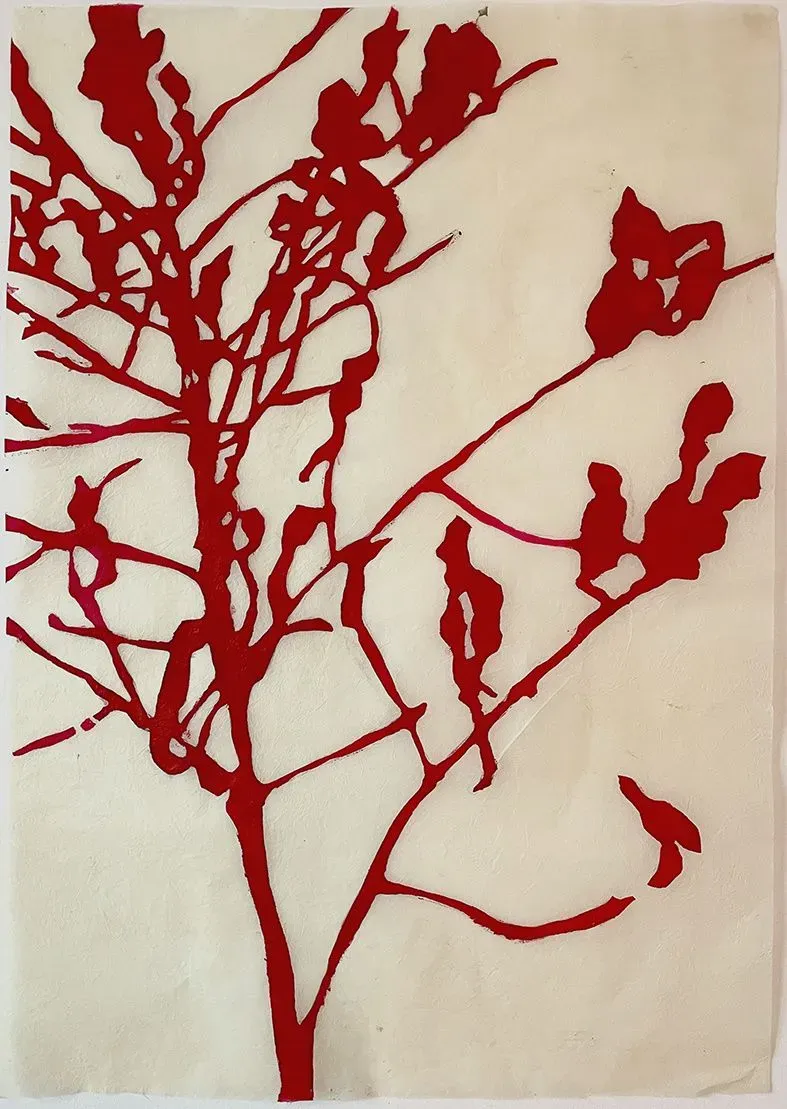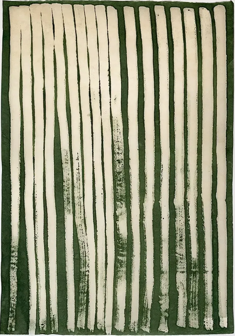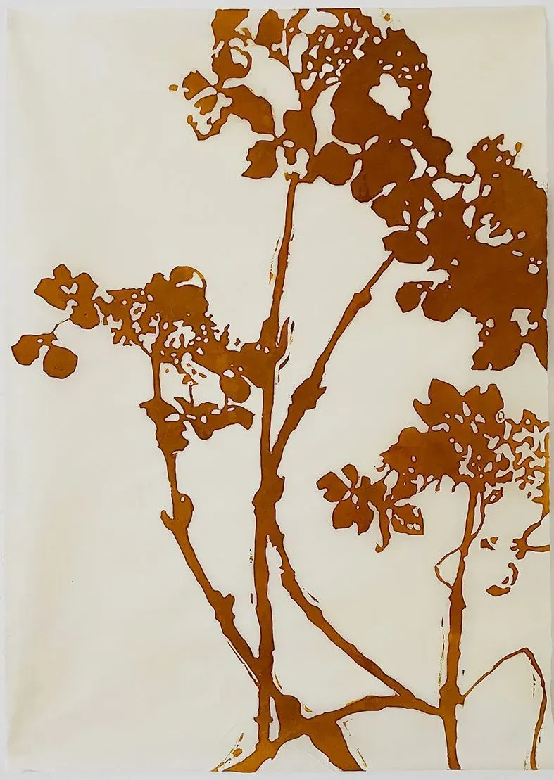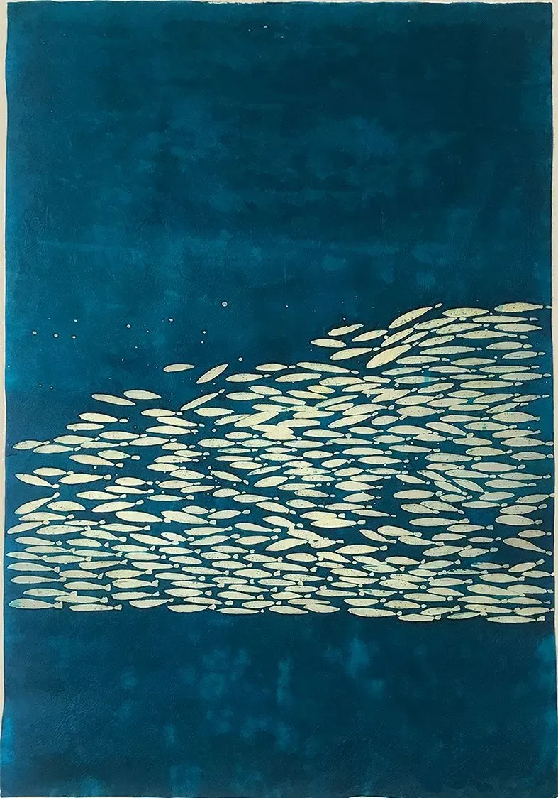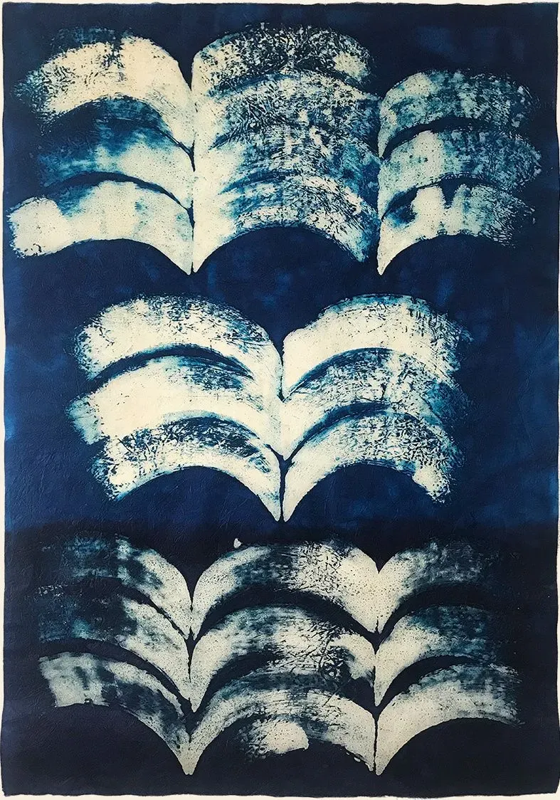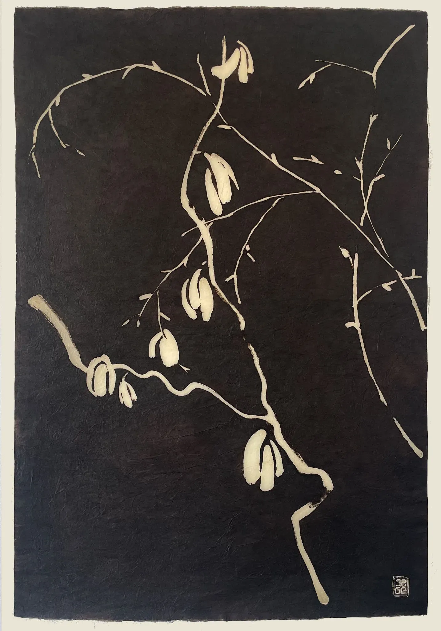 La cire fond dans la casserole, nous y plongeons nos pinceaux pour peindre en réserve des tracés bruts et des aplats que l’encre évite.