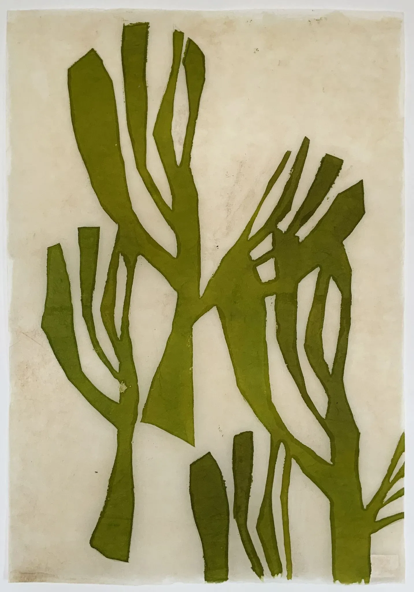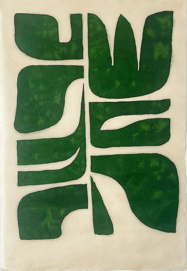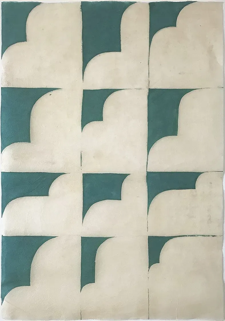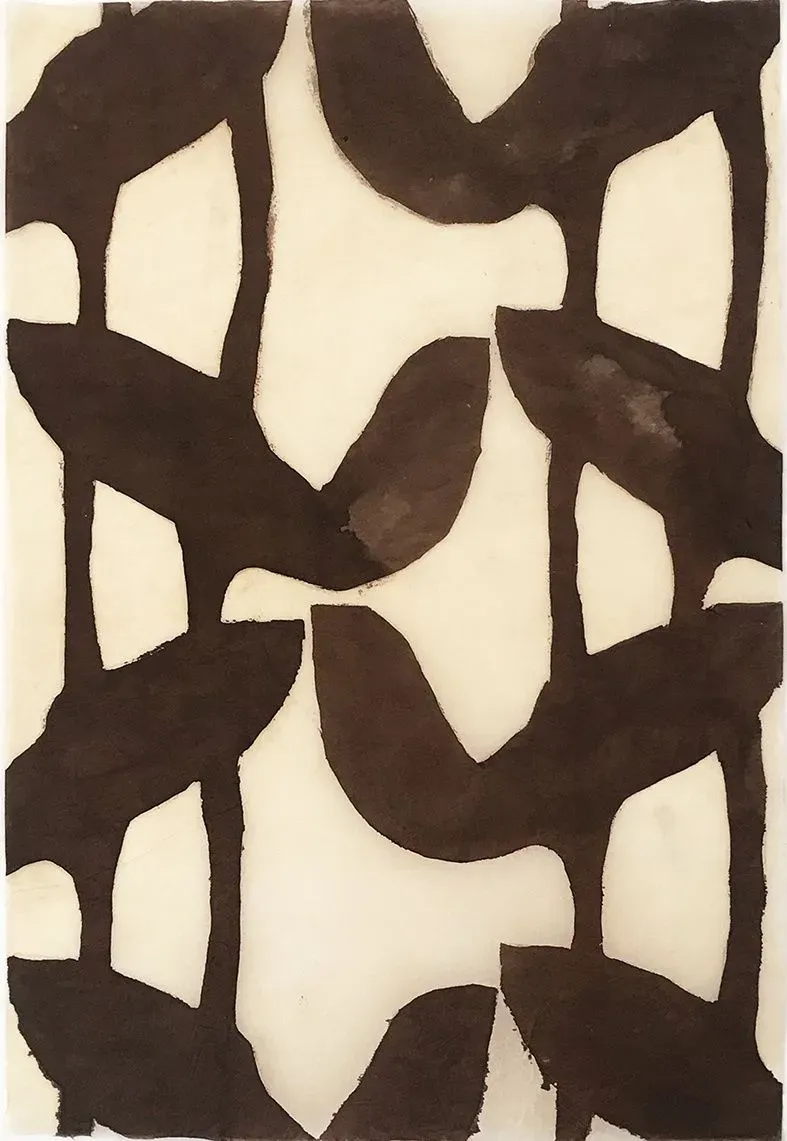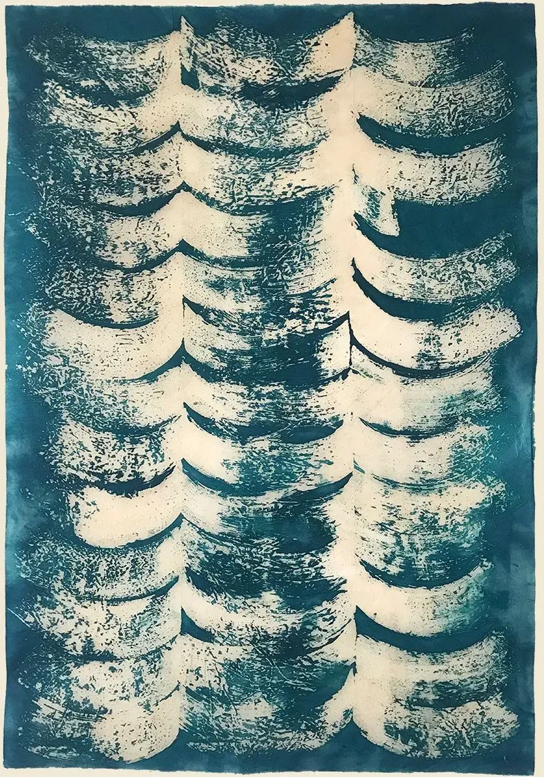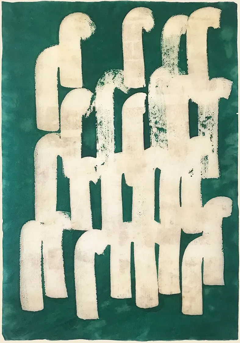 La cire fond dans la casserole, nous y plongeons nos pinceaux pour peindre en réserve des tracés bruts et des aplats que l’encre évite.